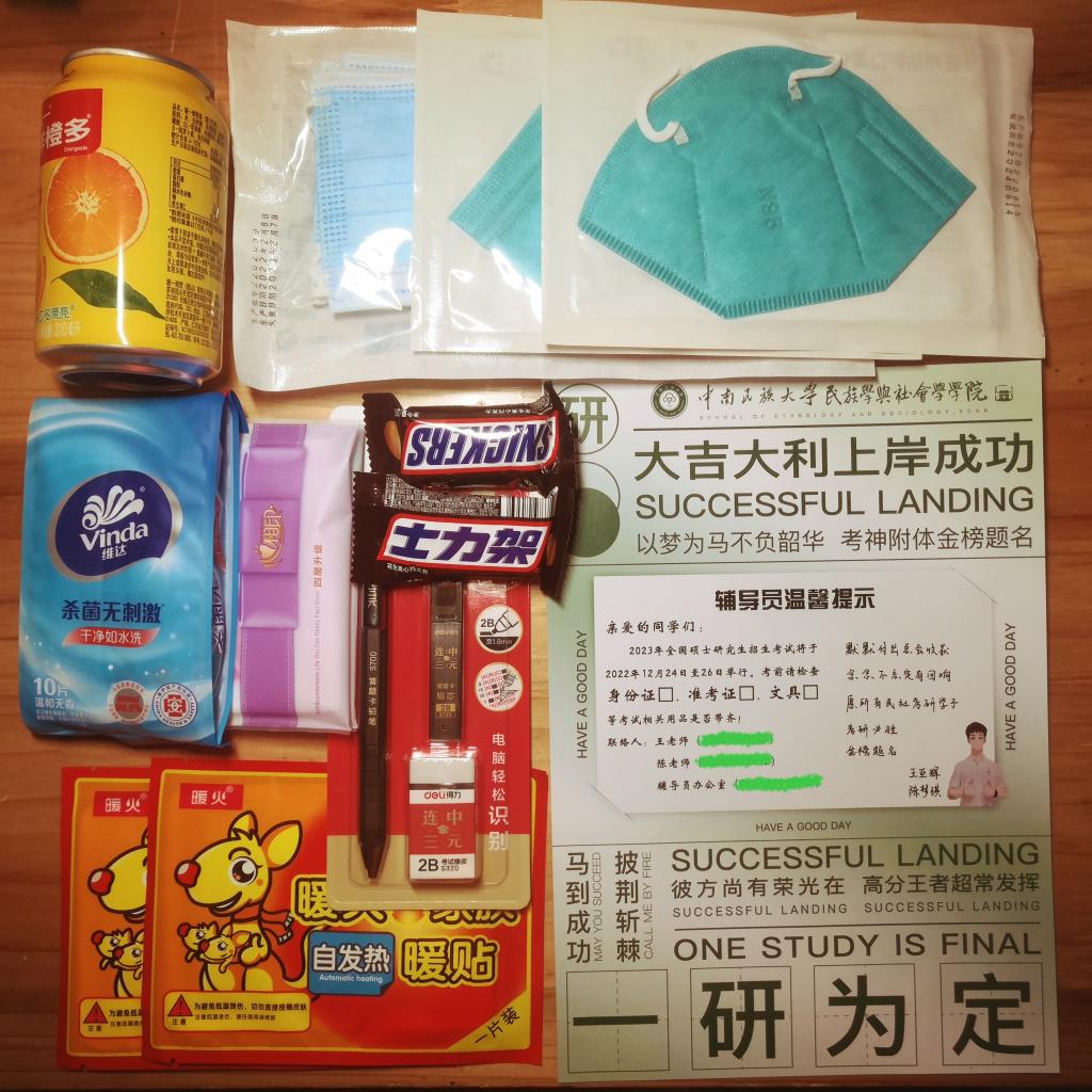 为了做好此次考研学生慰问工作,学院辅导员们在大礼包的准备方面花了不少心思,他们用心设计、精心准备、亲自装包,处处体现着爱心与温暖。考研大礼包里面有N95口罩、消毒湿巾等防疫物资,有印着“金榜题名”的文具用品,有补充体力的能量棒,有寓意成功的橙汁饮料,还有防寒的暖宝宝。最别具匠心的是辅导员亲自设计的考研加油卡片,橙粉绿黄蓝玫紫七种颜色的卡片寓意成(橙)功上岸、高分(粉)录(绿)取、飞黄腾达、美(玫)好人生、指(紫)定成功,卡片上还有辅导员的联系方式和暖心寄语,为学院考研学子温情护航。
