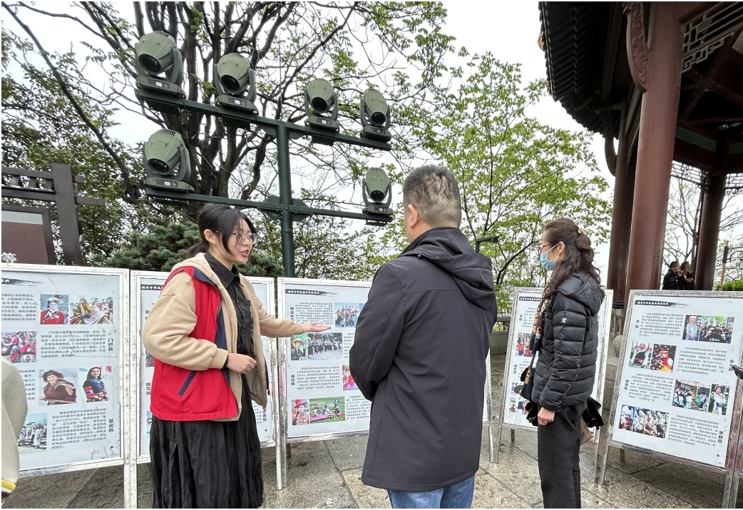 在黄鹤楼西广场,以“美美与共——中华各民族”为主题的宣传展吸引不少游客驻足观看。必赢官网民族学博物馆“西兰卡普”讲解志愿服务队志愿者们结合铸牢中华民族共同体意识专题展,现场为游客详细介绍了56个民族的基本概况和人文特色,同时宣传推广“道中华”微信公众号。