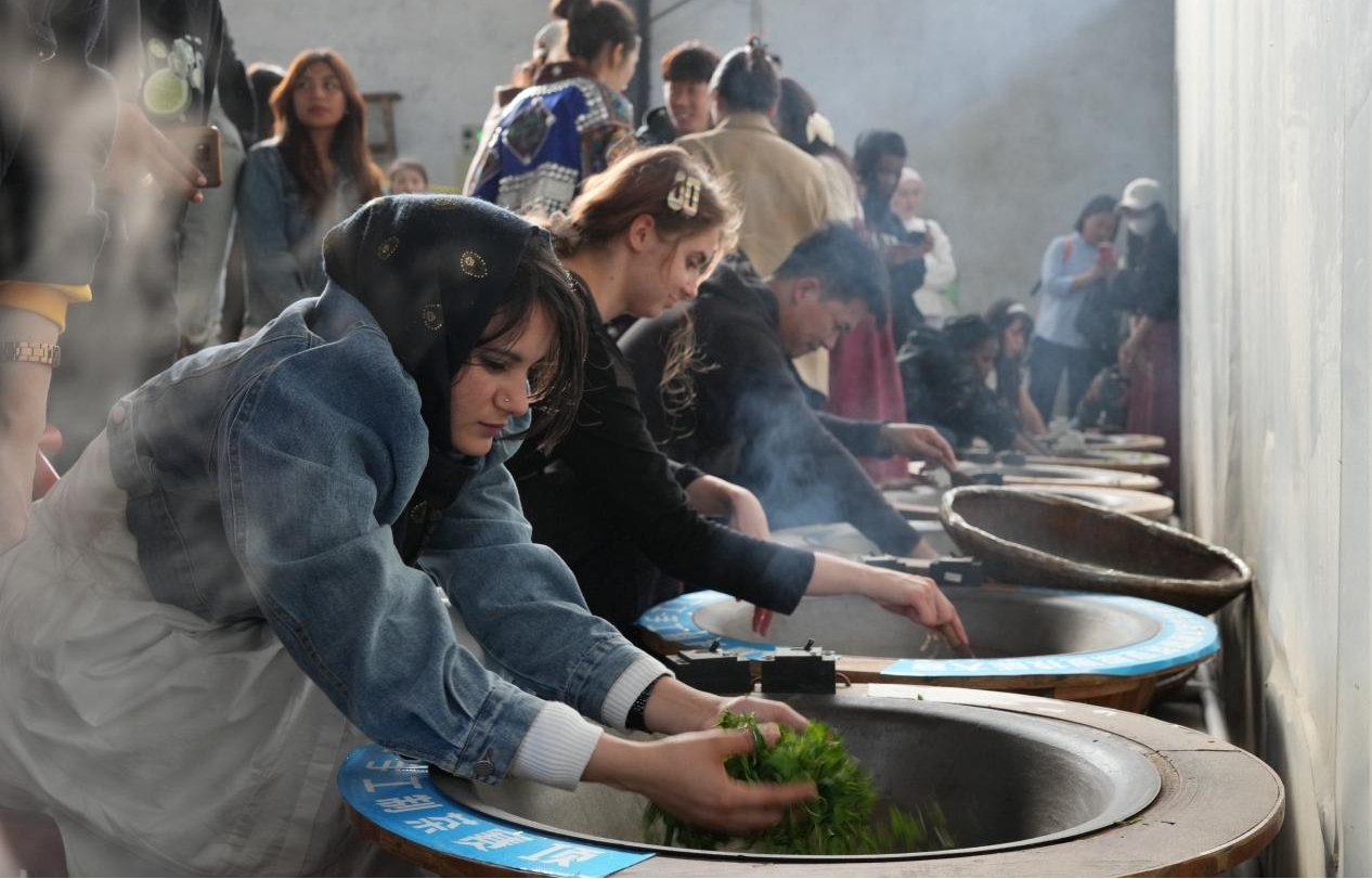 活动期间,留学生们兴致勃勃地参观了向家村现代农业产业园,了解了该村如何通过乡村振兴、产业发展从一穷二白发展成为组织强、产业兴、环境美、村民富的先进村。留学生们还与向家村农耕文化研学基地的高中生们开展了“共话茶乡新貌、共叙青年友好”的交流活动。当地各族青年学生热情好客,主动与留学生们结对,以茶会友,深入交流。在篝火晚会上,中外学生共同欣赏了中国传统舞狮表演、土家族民间八宝铜铃舞,一起跳土家族摆手舞,并演绎了《月亮代表我的心》《成都》等脍炙人口的中国歌曲。