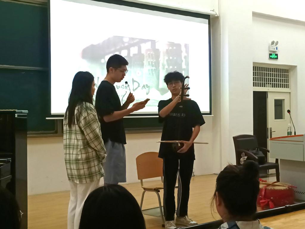 教室的讲台上,音乐舞蹈学院2022级学生肖瀚云用二胡演奏了《良宵》,曲声悠扬,在场学生们侧耳倾听,随着音乐节奏轻轻晃动,沉浸在这优美的旋律中。音乐舞蹈学院2022级学生黄玉冰熟练轻快地弹奏着古筝,外语学院的学生们用英文向在场的学生介绍古筝的结构和指法。