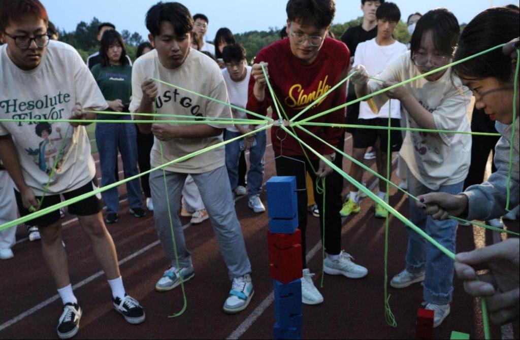 团日活动精彩纷呈,高潮迭起。“趣味拔河”,各团支部铆足一股劲,拧成一股绳,激烈角逐,“绳”采飞扬;“珠行万里”,同学们一弯一拾,小球穿越于众人的“股掌”间,划过的每一道痕迹,丈量着彼此“心”的间距;“一圈到底”,同学们手挽手、肩并肩,呼啦圈越过头顶的弧线,透出青春底色,奏响团结乐章;“合力搭搭”,十绳连心,呼吸与共,同学们俯身撑绳,屏息凝神,合力搭建起一幢幢“青春”的高楼。