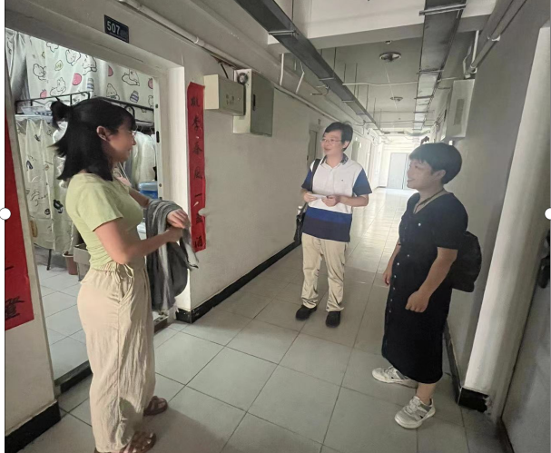 林晋带队来到南区本科生留校学生宿舍,查看每间宿舍的环境,详细询问每名学生的近况,解答每位同学咨询政策的问题。她对同学们在酷暑中坚持学习、工作的勇气和毅力表示赞赏,并提出了一些希望:要更加科学、有质有效地做好时间规划,在考研备考、实习实践等方面聚力聚焦,争取更大的进步;要克服客观困难,葆有吃苦精神,久久为功,善作善成;要遵守校纪校规,劳逸结合,时刻注重财产、人身安全。