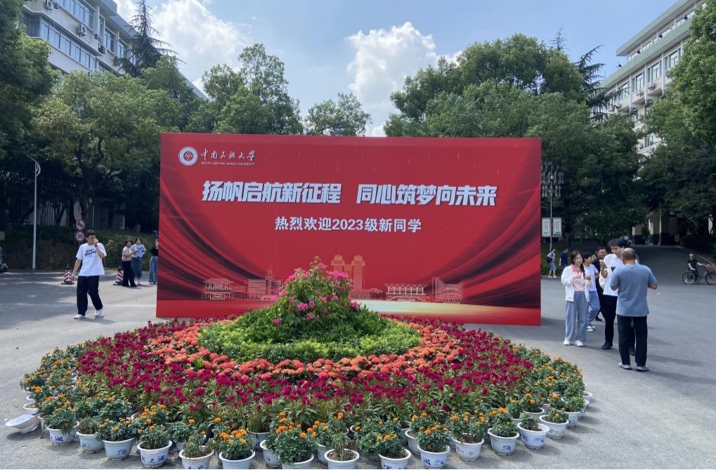 学校大门摆放了迎新花卉。 甘露摄