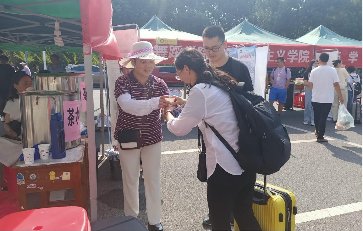 迎新总站为新生设立了茶水供应点。 张海鸥摄