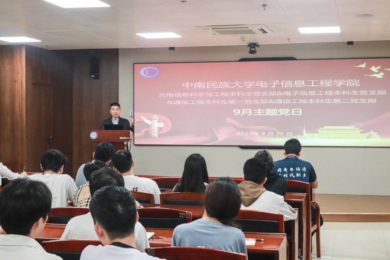 为进一步加强党员党性修养,推动主题教育走深走实,9月25日晚,电子信息工程学院本科生党支部在16号教学楼开展“学教育精神,担强国使命”主题党日活动。本次活动由光电信息科学与工程本科生党支部承办,电子信息工程本科生党支部、通信工程本科生第一党支部、通信工程本科生第二党支部共同参与。华中科技大学马克思主义学院博士汪建辉应邀上微党课。院党委书记魏大江、各支部全体党员、全体辅导员老师参加了活动。