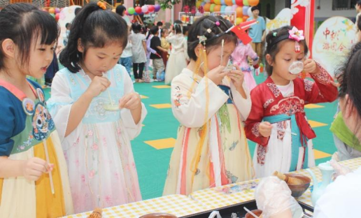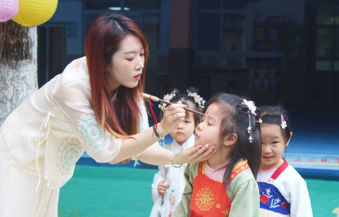 一系白衣,一装唐裙,幼儿园里瞬间冒出一群多彩缤纷的小朋友来。他们手握玉兔花灯,轻拂圆月画扇,井然有序地排队踱步到操场。看着古风古韵的活动布置,小朋友们难耐内心的好奇与激动,纷纷和身边的小伙伴分享新发现。“快看!老师在他额上画画呢!”“喔噢!好好看,那不是画画。”活动的第一个环节就是老师给小娃娃们点朱砂。“痣”通“智”,点上朱砂痣,既是对小朋友们寄托美好聪颖的愿望,也为古风古韵的氛围增添了一笔灵动。