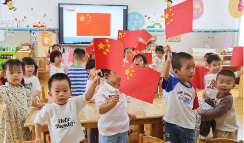 “老师,庆祝祖国妈妈生日,我们也想送礼物!”一声声稚嫩又亲昵的话语传递着小朋友们内心深处的爱国情怀。各班老师也正是观察到孩子们的愿望,准备了不同形式的爱国主题课程。课堂上,不论是考验耐性的积木建构课,还是比拼灵巧的手工制作课,小朋友们都专心致志,用自己的头脑去创新创意,把对祖国母亲的祝福和爱意流入作品当中。老师们以“云观摩”为切入点,引领小朋友们参观天安门,了解五星红旗诞生背后的故事,组织“闯关摘国旗”等小游戏,激发孩子们勇夺第一、向旗帜看齐的成长意识,实现高质效的“以情施教,依情助教”。