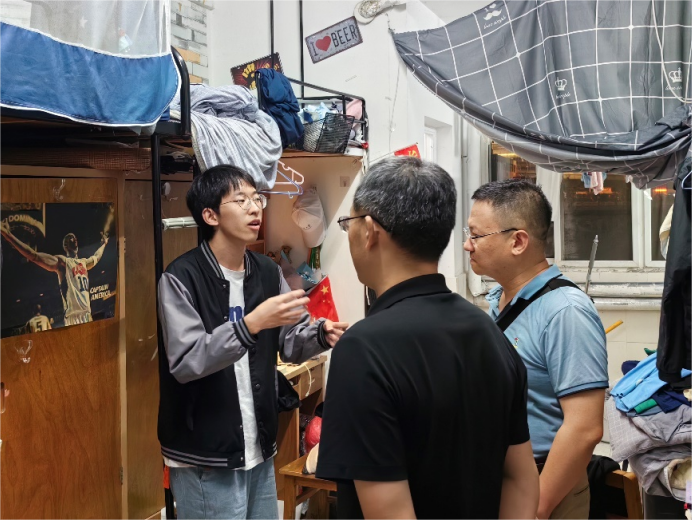 院党委书记刘子元、院长孙杰等领导、老师及团委学生会干部分别走访了北区4A、4B及南区30栋宿舍。走访过程中,学院领导老师仔细叮嘱同学们不论是在校还是回家时都要注意安全,平平安安过好每一天。副院长叶恒朋还与同学们在课业学习、寝室卫生、未来发展、就业方向等方面展开了深入的交流,对同学们在生活学习中的疑惑作了详细解答。