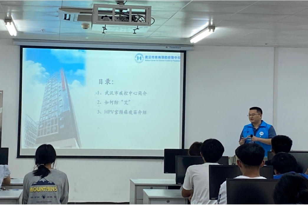 在16号教学楼,武汉市疾病预防控制中心党支部书记汪耀首先向同学做防范艾滋病科普。他详细讲解了艾滋病的3种传播途径,强调预防艾滋病的关键是“三要”和“三避”,提醒同学们接种HPV疫苗也是艾滋病预防的重要手段之一。