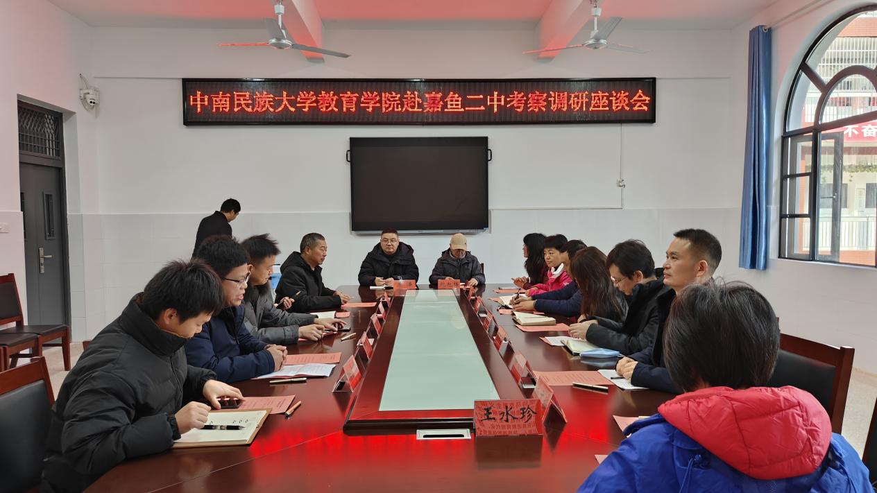 在嘉鱼县第二中学,尹六飞代表学校领导班子对教育学院老师们的到来表示热烈欢迎。教育学院党委书记林晋就本次活动目的、内容和意向进行了说明。教育学院院长万力勇从学科建设、人才培养、社会服务、学生实习就业等方面详细介绍了学院基本情况。嘉鱼县第二中学党总支书记、校长陈涛表示,希望与教育学院建立长期教学实践基地,并就学校心理健康教育工作开展合作,欢迎民大学子前往嘉鱼第二中学就业。双方就党建引领、学生实习、心理健康教育等工作的开展和师资引入等问题进行了深入交流。