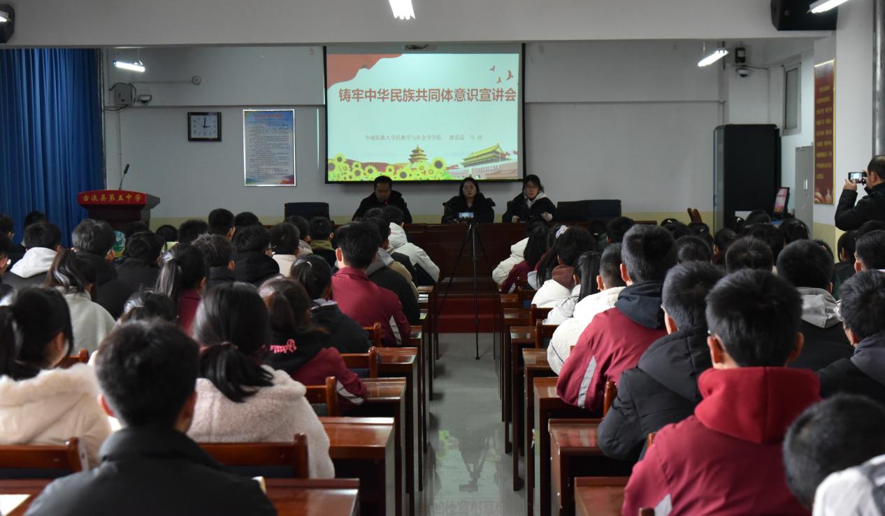 一路讲,讲青年使命,宣讲故事深入浅出。23日下午,宣讲团成员马欣、摆思蕊在古浪县第五中学作题为《新征程上铸牢中华民族共同体意识的青年行动与思考》的主题理论宣讲。宣讲中,团队成员从青年视角出发,阐释铸牢中华民族共同体意识的深刻内涵,分析如何实现各民族更好地交往交流交融。他们用“小故事”讲“大道理”,同时介绍了铸牢中华民族共同体意识的民大实践、民大经验,将深刻的理论内涵融入一个个鲜活的故事案例中,并辅以相关视频,以“青”言“青”语在学生心中播撒铸牢中华民族共同体意识的“金种子”,获得在场师生的一致好评。