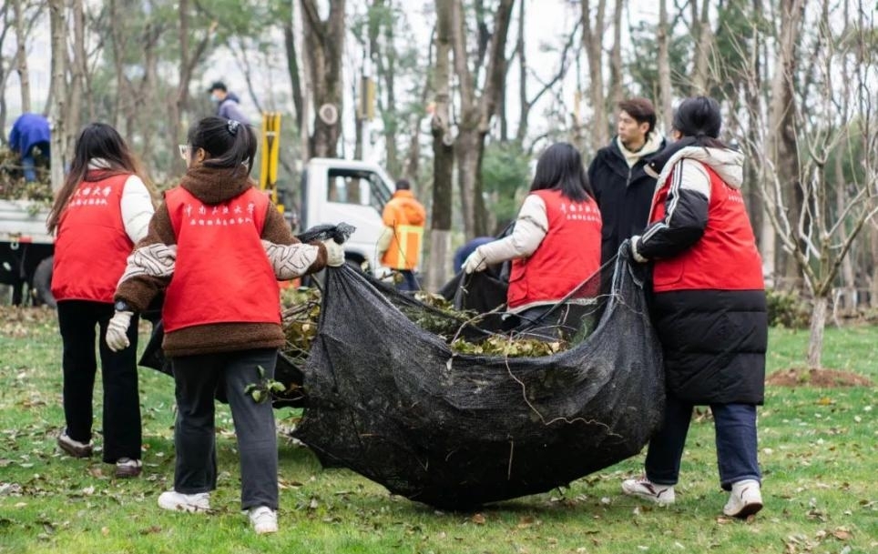 在南湖园和南区三、四食堂等附近的道路上,团员们和志愿者们身穿红色马甲,配合紧密,合理划分区域。他们搬移挡住路面的树枝,用铁锹铲冰除雪,清扫路面,一推、一铲、一扫,路面的残雪、冰渣以及掉落的树枝全部得以清除。