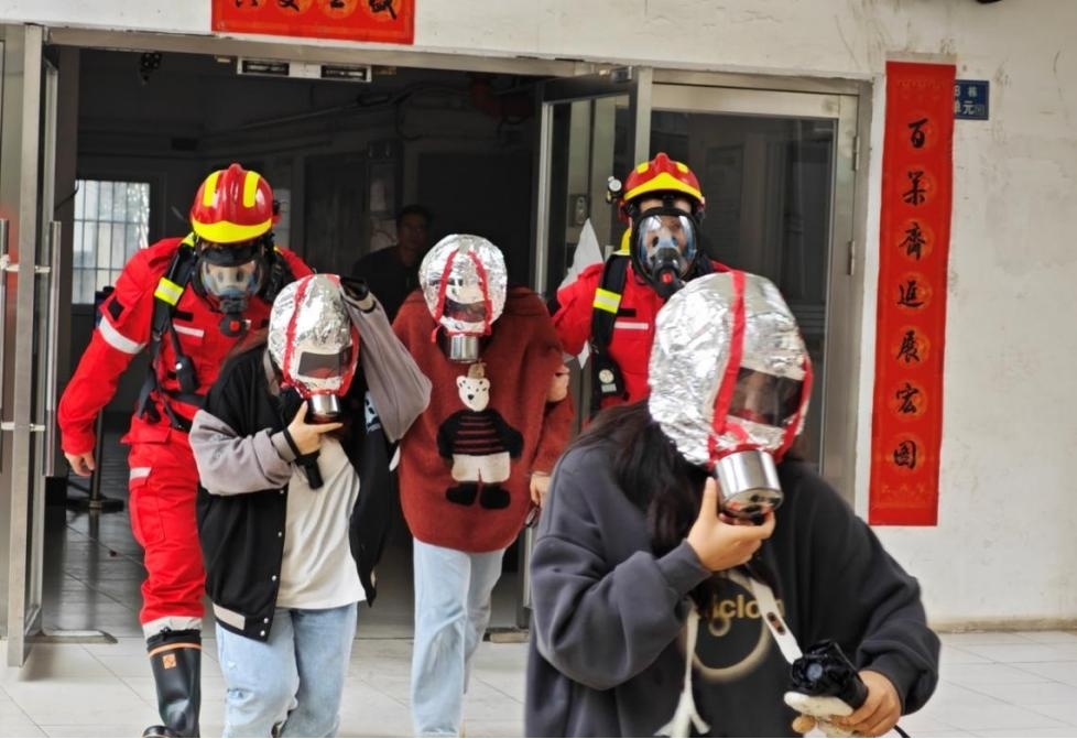“现在我们收到消息,有两名学生被困火场,我们的义务消防队队员立刻穿戴氧气瓶和防烟面罩,准备进场救人。”在疏散演习中,只见3A学生公寓浓烟滚滚,消防员驾驶着消防车从远处驶来,迅速穿戴消防装备冲入火场,成功营救出被困人员及“伤员”。疏散演习环节通过使用烟雾弹、拉响警报、消防车进场出水、医护人员抢救“伤员”等方式模拟真实火灾场景,引起师生阵阵惊呼,现场氛围浓厚。参与活动的师生反应迅速,严格按照应急逃生路线有序疏散,用衣服等物品捂住口鼻,低姿、快速穿越烟雾区,顺利到达安全区域。疏散演练后,保卫部人员就拨打消防应急电话、应急处置流程、消防经典案例等方面为师生讲解了相关消防安全知识。