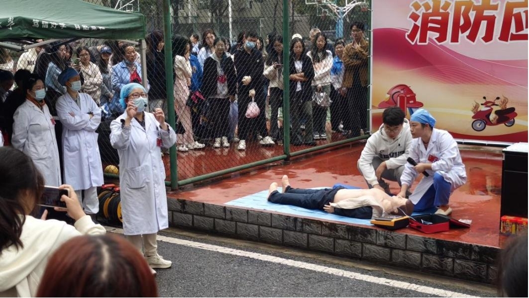 “1001、1002、1003——患者意识丧失,现在时间是下午两点半,帮忙呼叫120”,医护人员在现场对模拟“伤员”的人偶模型进行紧急心肺复苏抢救的同时,面向师生详细讲解了心肺复苏要领和自动体外除颤器(AED)的使用方法。现场大量师生参与学习并积极互动。