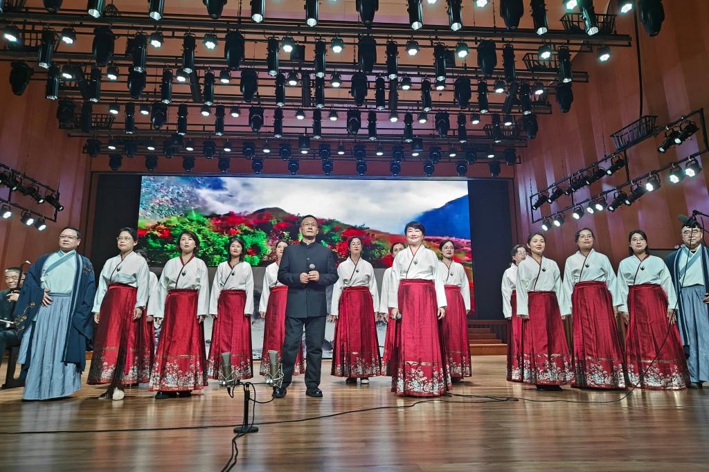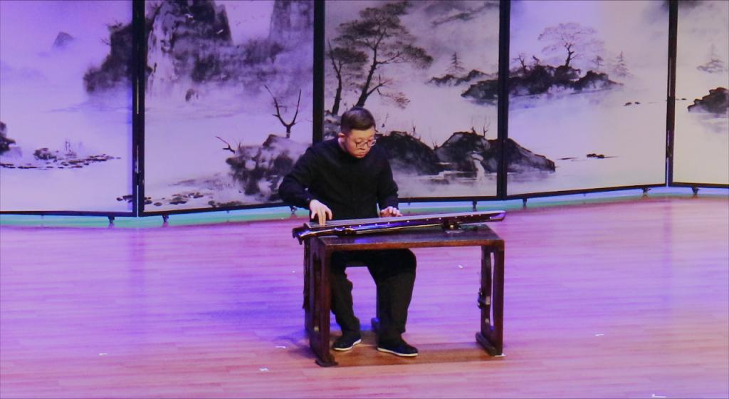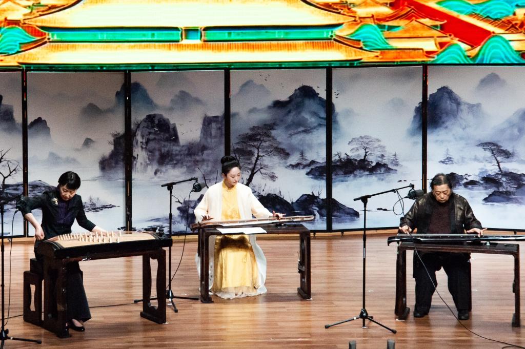 青年演奏家赵子天演奏了南宋琴家郭楚望创作的琴曲《潇湘水云》,借水光云影之感,表达一蓑烟雨、扁舟五湖之志,寄托眷恋故国、还我河山的深沉感慨。青年古琴演奏家丁霓裳演奏了古琴曲《离骚》,曲调古朴苍劲,深沉含蓄,意蕴深远。此次音乐会还邀请了国家级非遗传承人、著名古琴演奏家丁承运教授,琴瑟演奏家傅丽娜教授和丁霓裳老师共同演绎琴瑟弦歌《神人·南风畅》,琴瑟和鸣,节奏铿锵,音韵潇洒。全曲将终,3位音乐家吟咏《南风歌》,“南风之薰兮,可以解吾民之愠兮;南风之时兮,可以阜吾民之财兮”,表达出对伟大祖国国泰民安的诚挚祝福。
