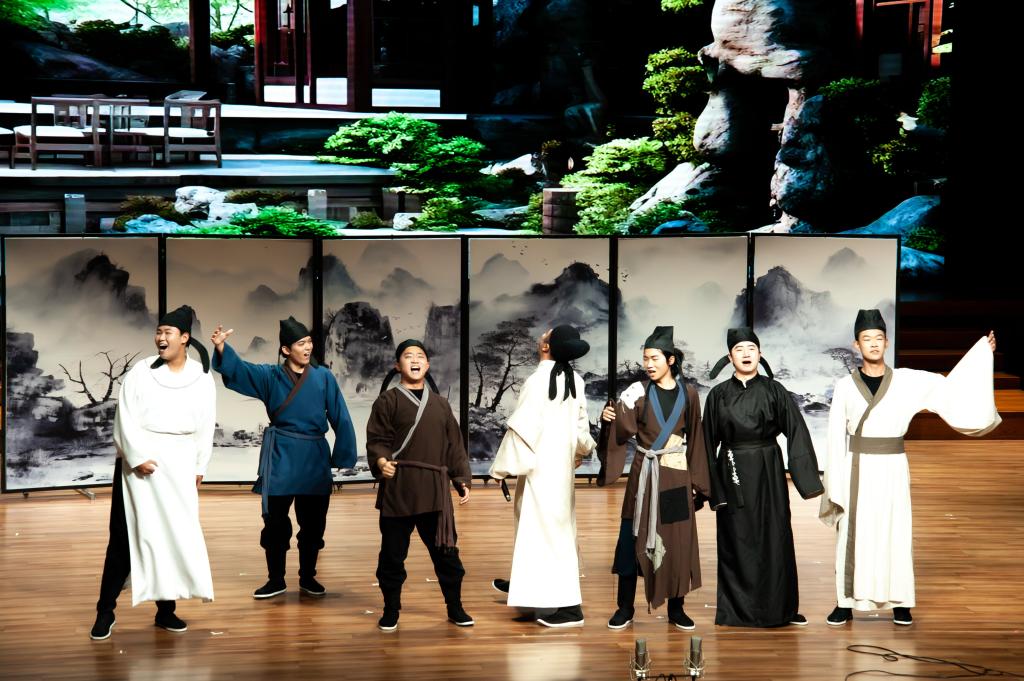 上半场,琴音婉转,歌声袅袅。琴曲《春风》《流水》等曲目随着弹奏者拨动琴弦,或奔放或舒缓的曲调泠泠流转,观众如痴如醉。《春之诗》《菩萨蛮》等表演是将传统吟诗调与新编吟诗调结合在一起,采用男女生小组唱的形式,既充分传达了古诗词意境,又符合现代审美。