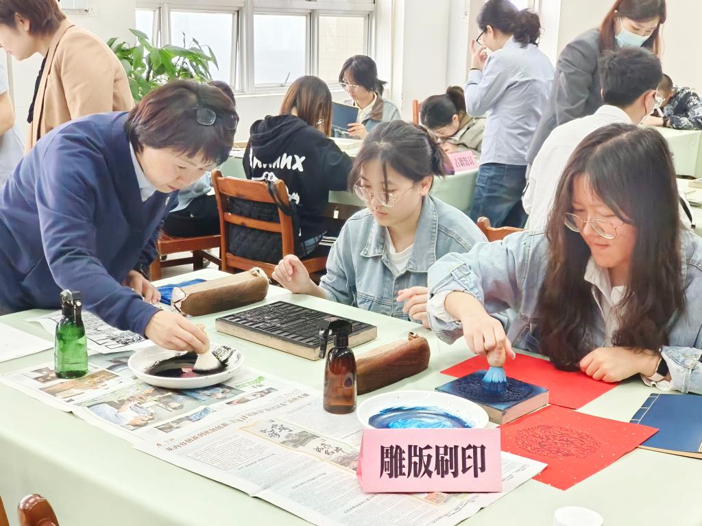 老师指导同学们体验雕版刷印。 罗曼祯摄