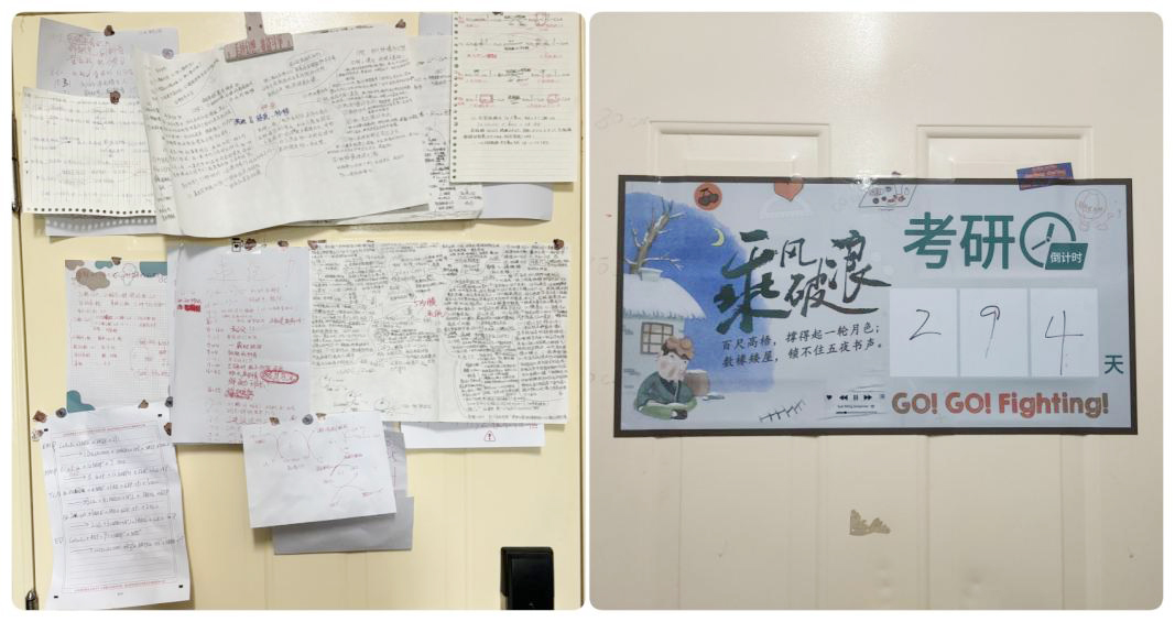 “学霸寝室”成功背后的是全员一心,同向同行,彼此监督,互相激励。上岸北京协和医学院的刘明洋回忆道:“我们寝室考研气氛非常好,每个人都在鼓励同伴。我们在寝室里悬挂了目标院校的名单,每天互相提醒,交流学习方法,讨论相关问题,为彼此加油鼓劲。”上岸本校的李原川说:“在考研复习准备的这一年,对于我们来说学到的不仅仅是书本上的专业知识,更多的还是为一个目标奋斗前进的坚持。在复习过程中时常也会怀疑自己,专业知识总是学了就忘,做过的错题也是一错再错,但总有一种力量让我们坚持下去,这种力量来自于我们之间相互的鼓励和加油,来自于学院老师对我们学习状态的关心和肯定,更来自于民大考研学习的那种相互促进的氛围。”