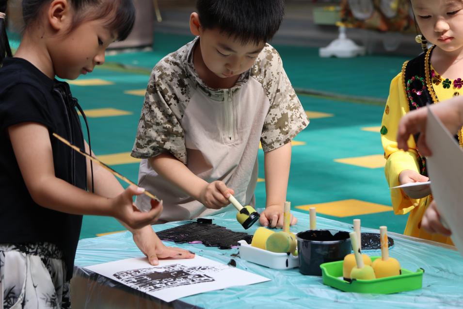 走进“非遗拓印坊”,孩子们被这项古老技艺深深吸引。小中班孩子选择自己喜欢的图案,用小手轻轻按压宣纸于雕版上,每一次揭起都是一次惊喜,图案跃然纸上,让他们兴奋不已。大班的孩子则将拓印完成在纸扇之上,赋予两种文化交流的意义空间,每一幅拓印作品,都是孩子们与历史对话的见证。