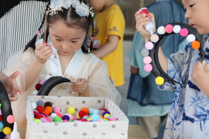 在古色古香的“簪花小铺”,孩子们变身成为小小匠人,亲手制作属于自己的传统头饰。在老师的帮助下,小、中班幼儿用粘彩球和少量花朵装饰发箍,手下小心翼翼,眼中闪烁着对美的初探,他们的作品虽稚嫩却饱含创意。大班的孩子则挑战了更复杂的发髻搭配,用花朵、叶子等进行搭配,从选材到造型,从大小到色彩,每一步都透露出他们对传统文化的尊重与热爱。