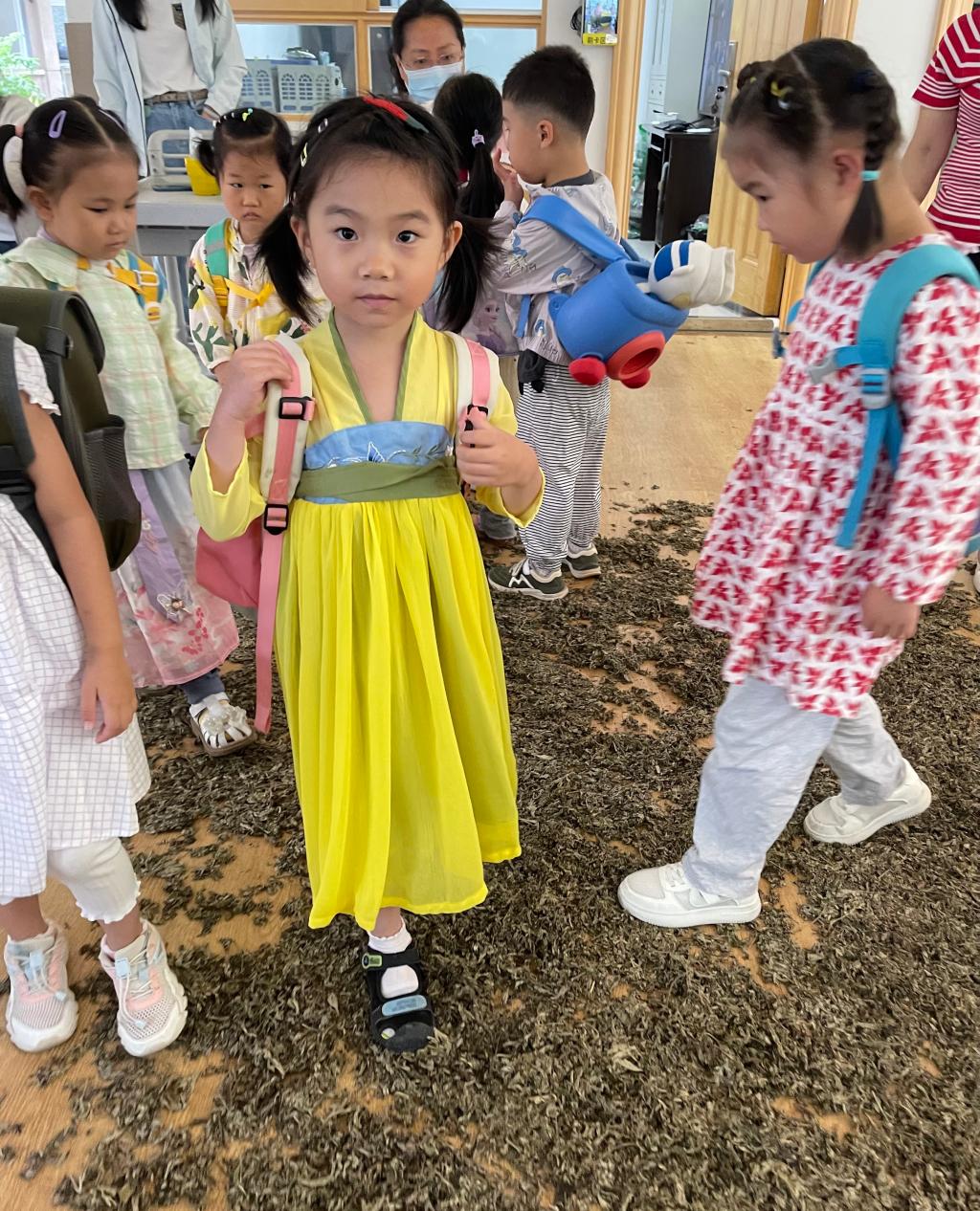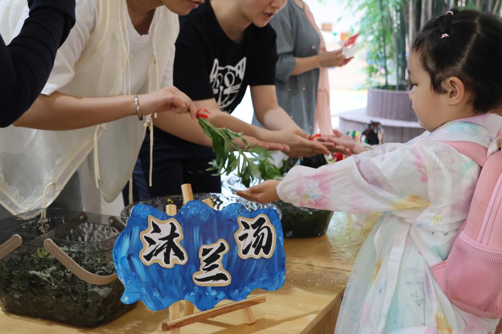 孩子们踏入艾叶铺设的小径,踏艾叶的习俗在他们的脚下生根发芽,清新的艾香混合着孩子们的笑声,编织成一首夏日的诗。接着,沐兰汤环节让孩子们的小手浸润在芬芳中,一张张稚嫩的脸庞上洋溢着对新奇仪式的喜悦,也传递出对纯净与健康的向往。最后在古老的习俗“画面额”中,老师们轻点朱砂,为孩子们额头上画上吉祥的红点,一笔一画间传递了对孩子们无尽的爱护与祝福。