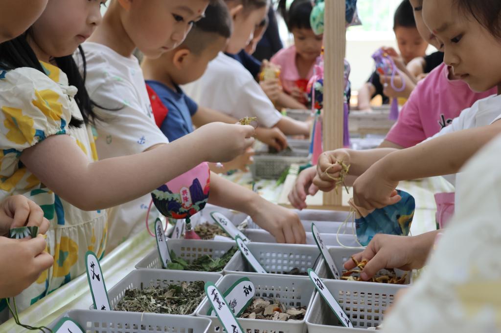 文化之旅转入多功能活动厅,这里成为了孩子们展示动手能力和创造力的舞台。“巧制香囊”活动中,小“工匠”们在老师的指导下,将艾草、菖蒲、白芷等各种香料小心翼翼地装入布袋,扣紧封口,填满了对家人的爱与对传统的敬仰。而在“五彩纳吉”环节,五彩绳在小手中翻飞,编制出一条条寓意吉祥的彩绳。孩子们在色彩的交织中体验到了艺术创造的乐趣,也加深了对传统色彩美学的理解。