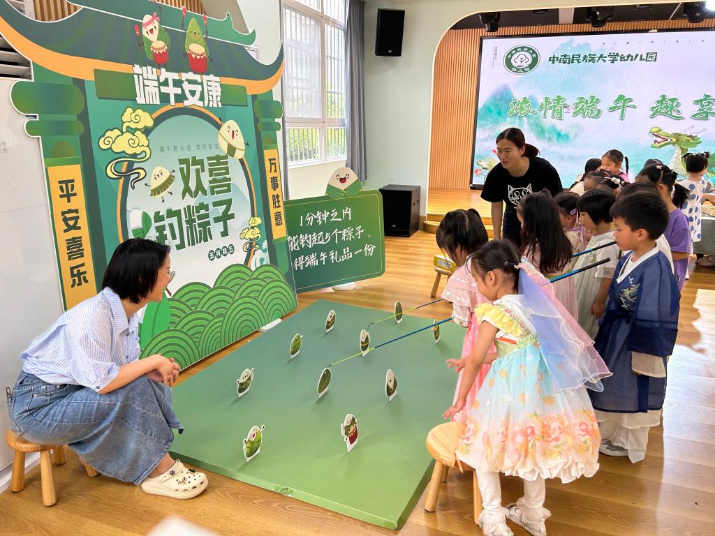 活动高潮迭起,“钓粽子”音乐游戏将整个庆祝活动推向了欢乐的顶峰。随着欢快的旋律响起,孩子们手握钓竿,在模拟的“江面”上努力“捕捉”粽子,每一次成功都伴随着欢声笑语。他们不仅体验了端午节的传统乐趣,也在游戏中学会了团队合作,增强了集体荣誉感。