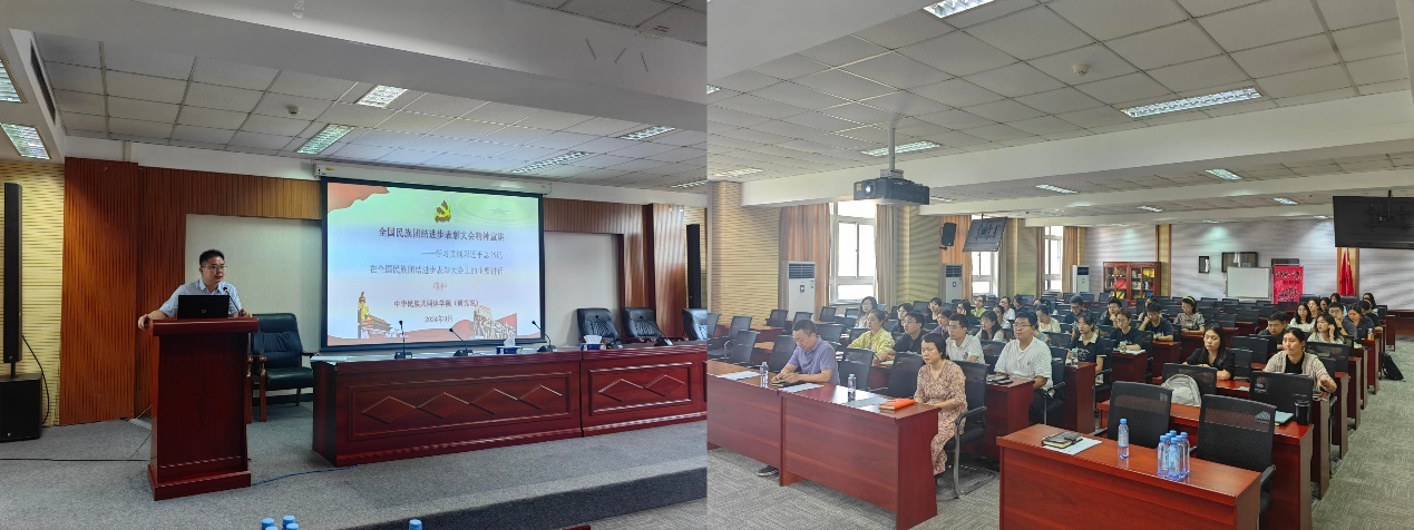 贺展向全体教职工、全体学生分别传达学习了习近平总书记在全国民族团结进步表彰大会上的重要讲话精神,并介绍了全国民族民族团结进步表彰大会的相关情况。师生进行了交流发言。
