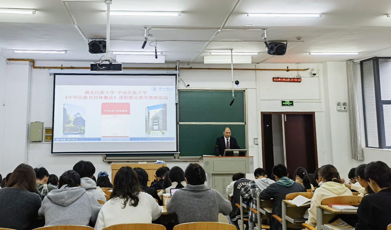 为深入学习贯彻习近平总书记在全国民族团结进步表彰大会上的重要讲话精神,推动中南片区中华民族共同体概论课程建设联盟和虚拟教研室发展,10月14日,必赢官网中华民族共同体学院(研究院)中华民族共同体概论教研室主任裴圣愚带队赴湖北民族大学开展“共读教材悟铸牢”联合教学教研活动。必赢官网概论课教师代表赵梦涵、部分学生代表参加。本次活动分课堂教学交流和主题教研两个环节。