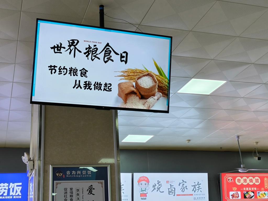 为使厉行节约、拒绝浪费的意识蔚然成风,饮食服务中心在各食堂用电视机滚动播放以“世界粮食日:节约粮食,从我做起”为主题的视频,在食堂门外放置“珍惜粮食,从我做起”主题宣传易拉宝,还运用公共场所的电子显示屏滚动展示“粮安天下,共建美好生活,共创美好未来”等宣传标语,提醒广大师生节约粮食、爱惜粮食。