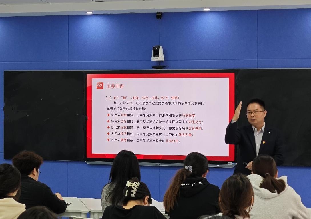 贺展从“两个大局”的高度和“两个结合”的深度来引导大家深刻理解铸牢中华民族共同体意识是习近平总书记作出的重大原创性论断,是马克思主义民族理论中国化时代化的最新成果。他通过对比历届全国民族团结进步表彰大会盛况,来介绍学校中华民族共同体学院(研究院)被中共中央、国务院授予“全国民族团结进步模范集体”荣誉称号的含金量。这不仅是荣誉,也代表着党和国家沉甸甸的信任与责任。他还分享了在表彰大会中的见闻与感想,让同学们深刻领会了习近平总书记在全国民族团结进步表彰大会上发表重要讲话中蕴含的深刻道理。