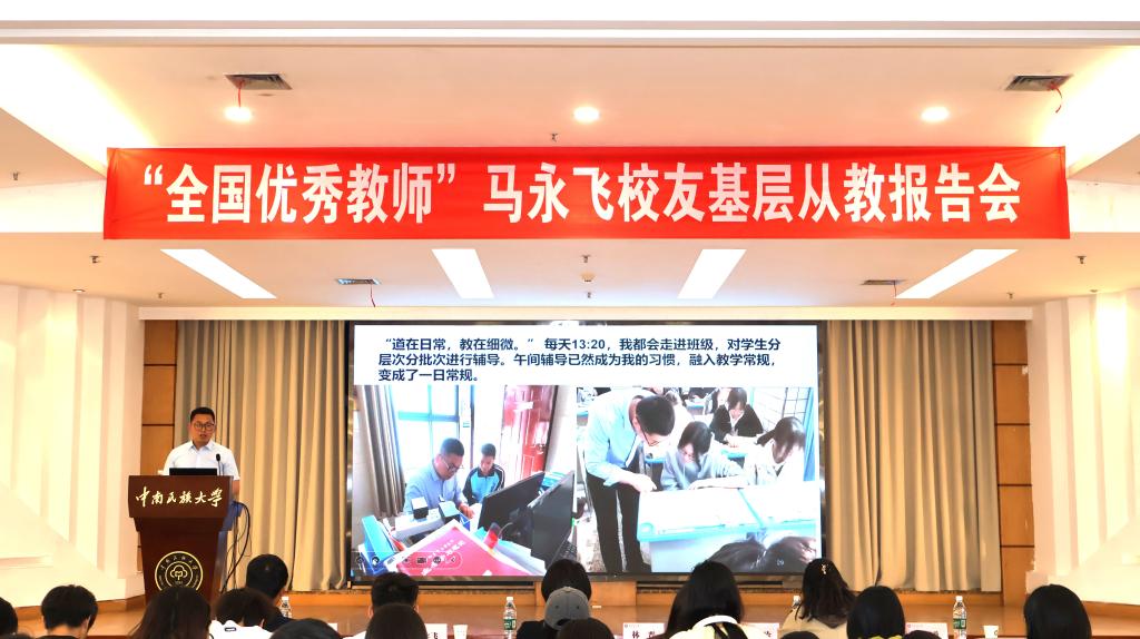 最后,包莉娜作总结讲话。她对马永飞长期坚守乡村、奉献教育的精神给予高度肯定,并向全体学子提出3点殷切希望:一是希望同学们坚定教育理想,勇担时代使命;二是希望同学们练就扎实本领,提升育人能力;三是希望同学们厚植人民情怀,扎根基层热土。她勉励同学们以马永飞为榜样,在未来的教育道路上勇敢担当、砥砺前行,为建设教育强国注入更多青年智慧与民大力量。