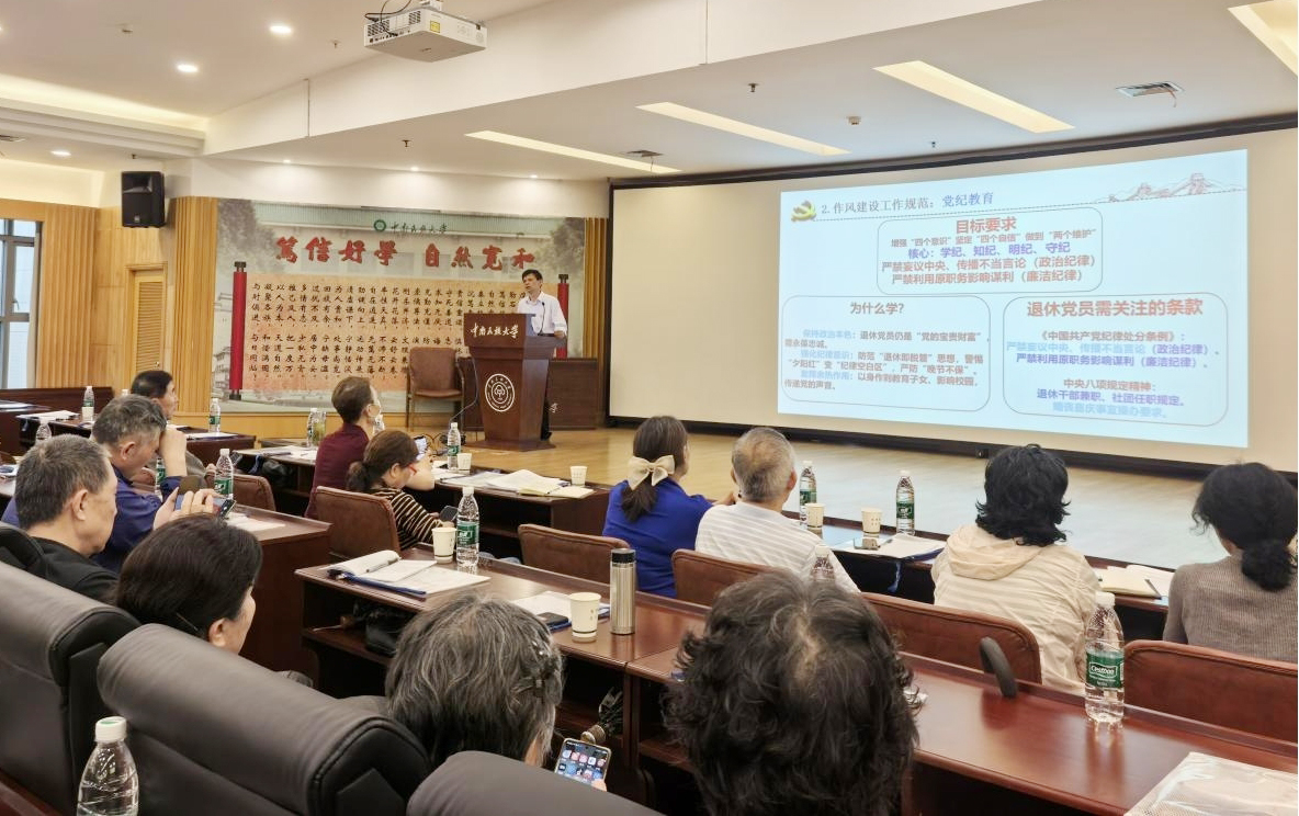 离退休工作处党委书记、处长张文军以“学条例 守纪律 强作风”为主题,围绕党支部标准化规范化建设核心纲要,从政治建设标准、组织建设标准、组织生活标准、党支部书记队伍建设标准、党员队伍建设标准、基础保障标准和考核评价标准等方面,结合中央八项规定及其实施细则精神,深入浅出地讲解了在标准化规范化支部建设中的具体践行规范和要求。
