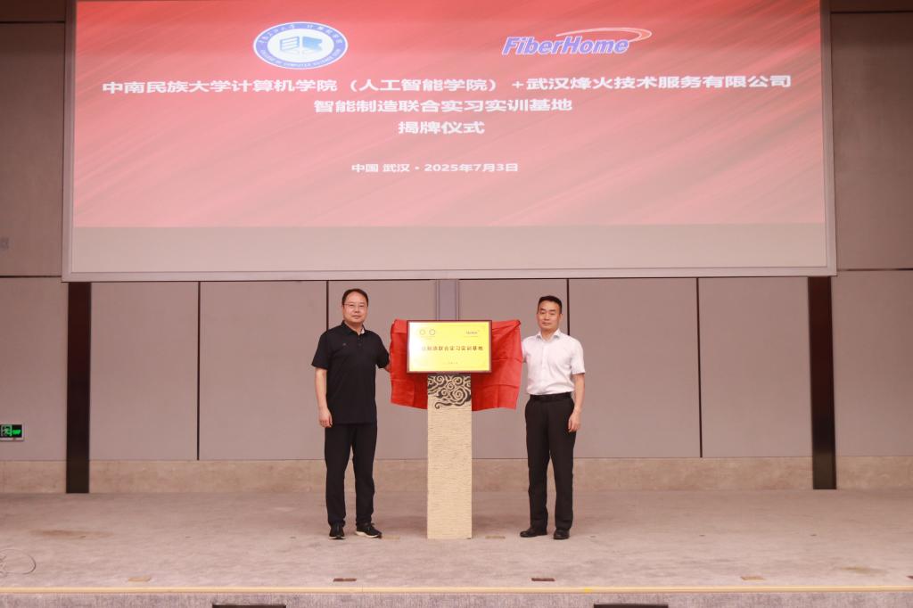 双方在公司报告厅举行智能制造联合实习实训基地揭牌暨学生实习实训活动颁奖仪式。姚全锋在发言中表示,公司高度重视校企合作,将以联合实习实训基地为依托,助力培养行业创新型人才。帖军指出,烽火的成长历程映射了中国通信行业突破“卡脖子”技术的奋斗史,而高校的使命正是为这一进程持续输送人才。徐东磊在致辞中表达了对双方合作的期待与信心。姚全锋与帖军共同为智能制造联合实习实训基地揭牌。
