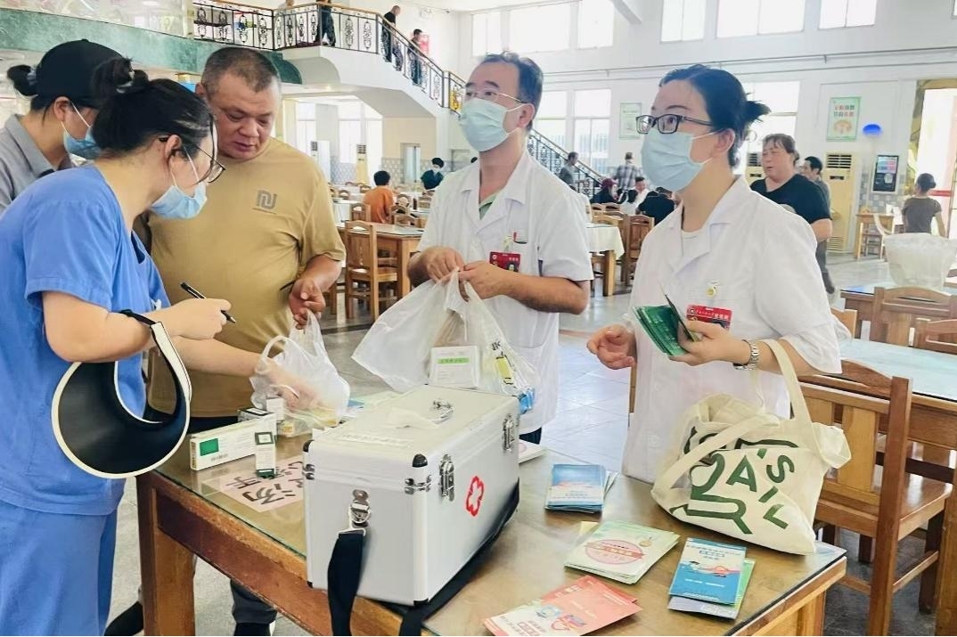 医务人员先后前往图书馆,15号、16号教学楼,学生二食堂,校门门岗等师生聚集单位和窗口服务部门,为坚守岗位的教职员工和留校学生送去藿香正气水/丸、十滴水、葡萄糖口服液等防暑药品,以及传染病防控、食源性疾病科普、“三减三健”生活方式等健康教育宣传折页。每到一处,医务人员细心询问师生员工工作、学习强度与身体状况,叮嘱大家注意劳逸结合,做好防暑降温措施。