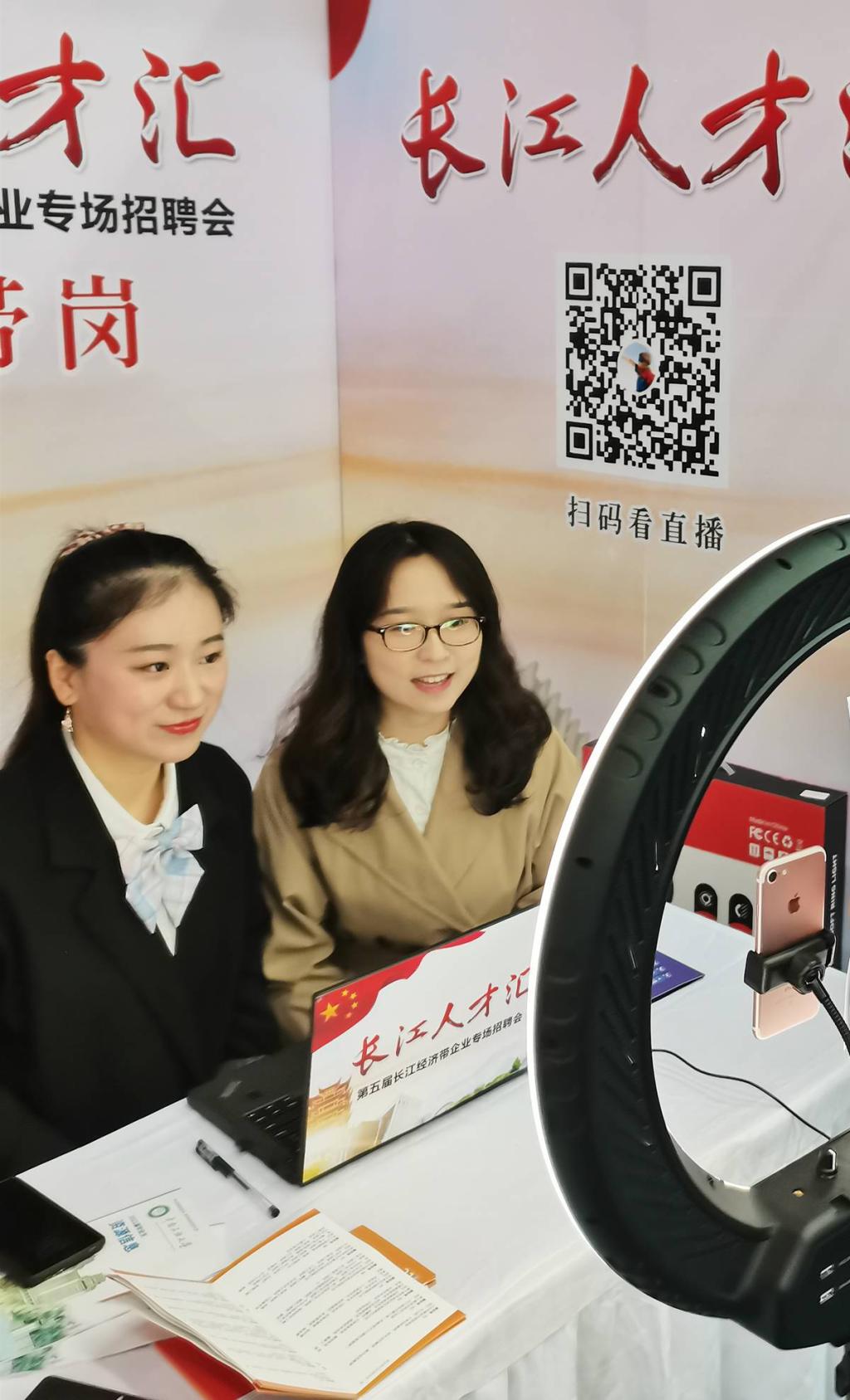 “直播带岗”是此次招聘会一大亮点。为缩短企业同求职者的距离、提升招聘活动覆盖范围,本次招聘利用互联网技术,将招聘与直播相结合,邀请百捷集团、长江存储、兴发集团、华工正源、京东方等知名企业招聘负责人在直播间作宣讲,并与线上求职者互动。