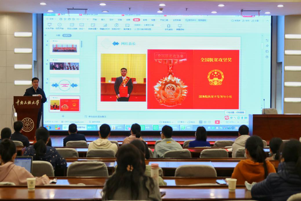 本次报告会以“把论文写在大地上——高校扶贫干部的安化实践”为主题,围绕电商直播对扶贫工作的意义、安化黑茶的推广取得的丰硕成果和宝贵经验进行分享。陈灿平指出,电商扶贫不仅扩大了贫困地区新增消费需求,助力当地的经济发展,促进了贫困户增收,还打开了贫困地区与现代文明的直接通道,改变了传统观念,让农民通过一台电脑和一部手机就能实现自主创业。他希望高校师生扶贫要将思考转移到农村大地,将以人民为中心作为践行标准,将忠诚、干净、担当作为不变初心,将专业知识与社会服务结合起来应用于实践,以新方式、新担当、新作为,勇于开创民族地区乡村振兴新局面。