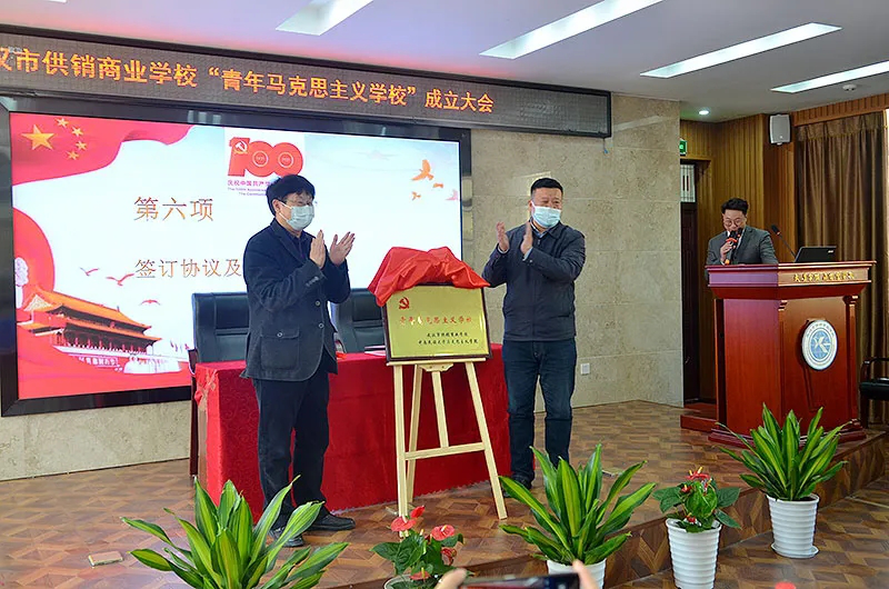 3月24日下午,马克思主义学院与武汉市供销商业学校共建“青年马克思主义学校”揭牌仪式举行。武汉市教育局一级调研员夏继敏、团委书记余丽艳,武汉市洪山区团委书记黄艳,武汉市供销商业学校校领导沈敏、王涛、鄢鸣、丁洁梅、张莹珺,马克思主义学院党委书记魏大江、院长杨金洲、副院长董杰及教师代表参加揭牌仪式。