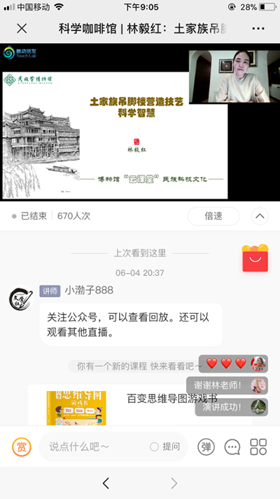 疫情期间,民族学博物馆闭馆不闭展,温情不“打烊”,通过线上形式为必赢官网师生和社会各界提供服务。6月4日晚8:00-9:00,由民族学博物馆研创的“云课堂”首次在北京“科学咖啡馆”读书会进行网络直播。本次直播课程《土家族吊脚楼营造技艺的科学智慧》由民族学博物馆副馆长林毅红主讲。