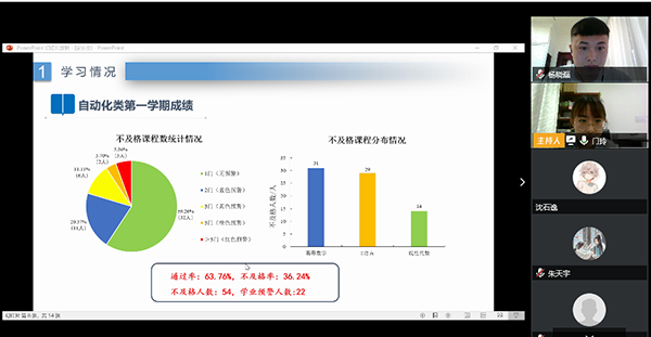 辅导员门玲、杨晓磊分别介绍了2019级第一学期学业预警情况、各专业成绩分布情况和本学期线上学习情况。在同学们居家学习期间,辅导员与任课老师之间通过信息共享、课堂督察等形式,时时关注学生在线学习状态,掌握学生课堂出勤以及作业完成情况。两位老师强调,由于大一学生仍然处于学习习惯的养成和转变期,家长们要配合学院做好学生学习方面的监督管理工作。