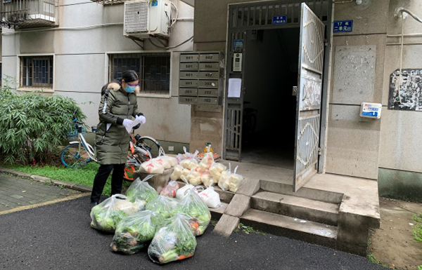 朱晶晶老师给楼栋居民送菜。文传学院供图