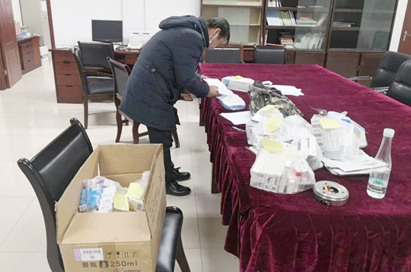 刘东对采购的药品进行分类。离退休工作处供图