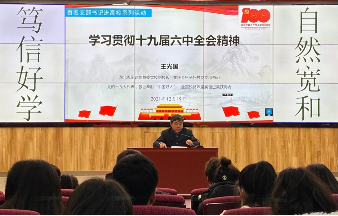 12月19日晚,“百名支部书记进高校”系列活动课程在1号教学楼举行,全国脱贫攻坚奖奋进奖获得者、湖北恩施建始县委党校副校长、龙坪乡店子坪村党支部书记王光国应邀来校授课,宣讲党的十九届六中全会精神。马克思主义学院本硕学生,校学生骨干训练营、学生成长训练营、天山雪育工作室、学生工作通讯杂志等团队同学参加了此次讲座。讲座由马克思主义学院党委书记魏大江主持。
