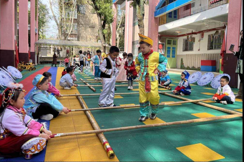 这边,伴随着欢快的音乐节奏,大班的孩子们身着漂亮的服饰,轮流扮演角色,在竹竿有节奏、有规律的碰击声里,敏捷地进退跳跃,潇洒自如地做着各种优美的动作。“嘿!呵嘿!”场面极是豪迈洒脱,热烈有趣。