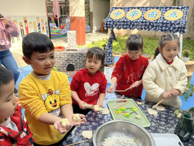 “我想给小丸子做个蝴蝶结”“我想做个大熊猫”“我帮你把东西送到那边的灶台蒸熟”“那我们就去那儿吃点心,品品茶吧?”……孩子们自由开心地表达着自己的想法。