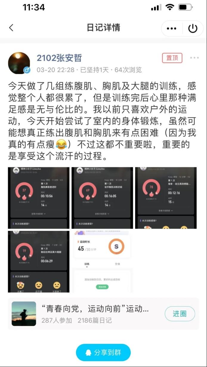 “我被我亲爱的宿舍长王国芬女士卷到了,她连看个视频都要手举矿泉水瓶练肱二头肌,洗澡前还会去楼道跳绳,图书馆自习一下午,吃晚饭前还要先在南湖操场跑3公里……动作到位,感情充沛。运动界的卷王,舍她其谁?”这是3月31日,电信学院一位女生在院团委学生会公众号上的“吐槽”。一段时间以来,电信学院学生走出宿舍,走进操场,远离宅寝生活,投身运动锻炼,不断刷新自己的运动量,掀起春季运动打卡活动热潮。