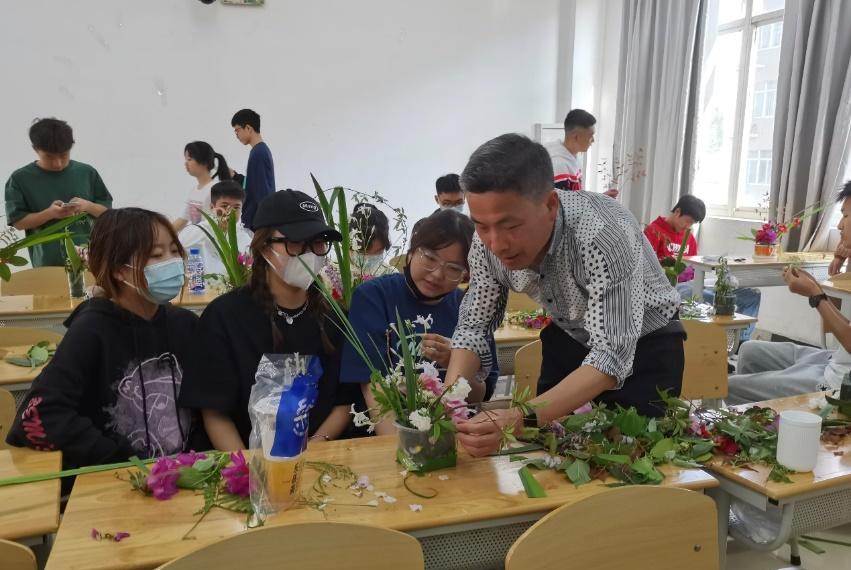 “要选择合适的花材,注重色彩搭配和造型,这样才能营造出高雅深远的意境。” “艺术作品要创新,要更具时代生命力。”时值清明,莺飞草长,花木飘香。生科类2107班在班导师龚汉雨的带领下开展了插花艺术实践活动,把生物学和艺术美学知识进行了有机融合。同学们3人一组,在龚老师悉心指导下,体验了插花工艺的制作。每组制作了2-3个作品,再进行展示、赏析和讲解。“红花和紫花、粉红色花材搭配,这样就和谐、不突兀。” “按照中华传统美学思想,可以适当利用线形柔枝飘逸的动感,形成深远的意境。”龚老师从理论和实践两方面进行插花工艺技巧讲解,同学之间相互点评帮助,都完成了满意的插花作品。