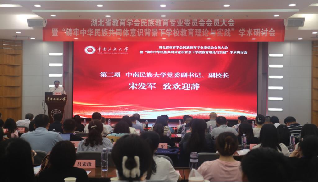 校党委副书记、副校长宋发军出席大会并致辞,他向莅临会议的专家学者表示欢迎与感谢并介绍了学校的办学理念和铸牢中华民族共同体教育情况,期待在学会的努力下推动湖北省铸牢中华民族共同体意识教育实现新发展。