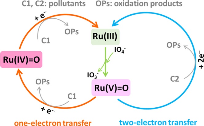高碘酸盐(periodate,PI)当pH=4时,氧化还原电位为+1.6 V,作为一种氧化剂已被应用于水净化及消毒等领域,但PI单独氧化有机污染物大多效果不佳或反应速率不能满足实际应用需要。因此,如何增强PI的氧化能力具有重要的科学和应用价值。该论文以Ru(III)离子为催化剂,构建了Ru(III)/高碘酸盐反应体系,实现了对水中有机污染物的高效氧化,其催化降解卡马西平的性能比其他金属催化体系高出至少两个数量级。更为重要的是,该论文还证实了反应体系中的Ru(V)=O的主导作用,采用X射线吸收谱和扩展X射线吸收精细结构拟合,率先揭示了Ru(V)=O的化学结构;设计探针实验,阐明了Ru(V)=O在一电子和两电子氧化中的Ru催化循环过程及Ru(IV)在一电子氧化中的重要作用。这一研究极大地丰富了对Ru催化循环过程与机制的认识。