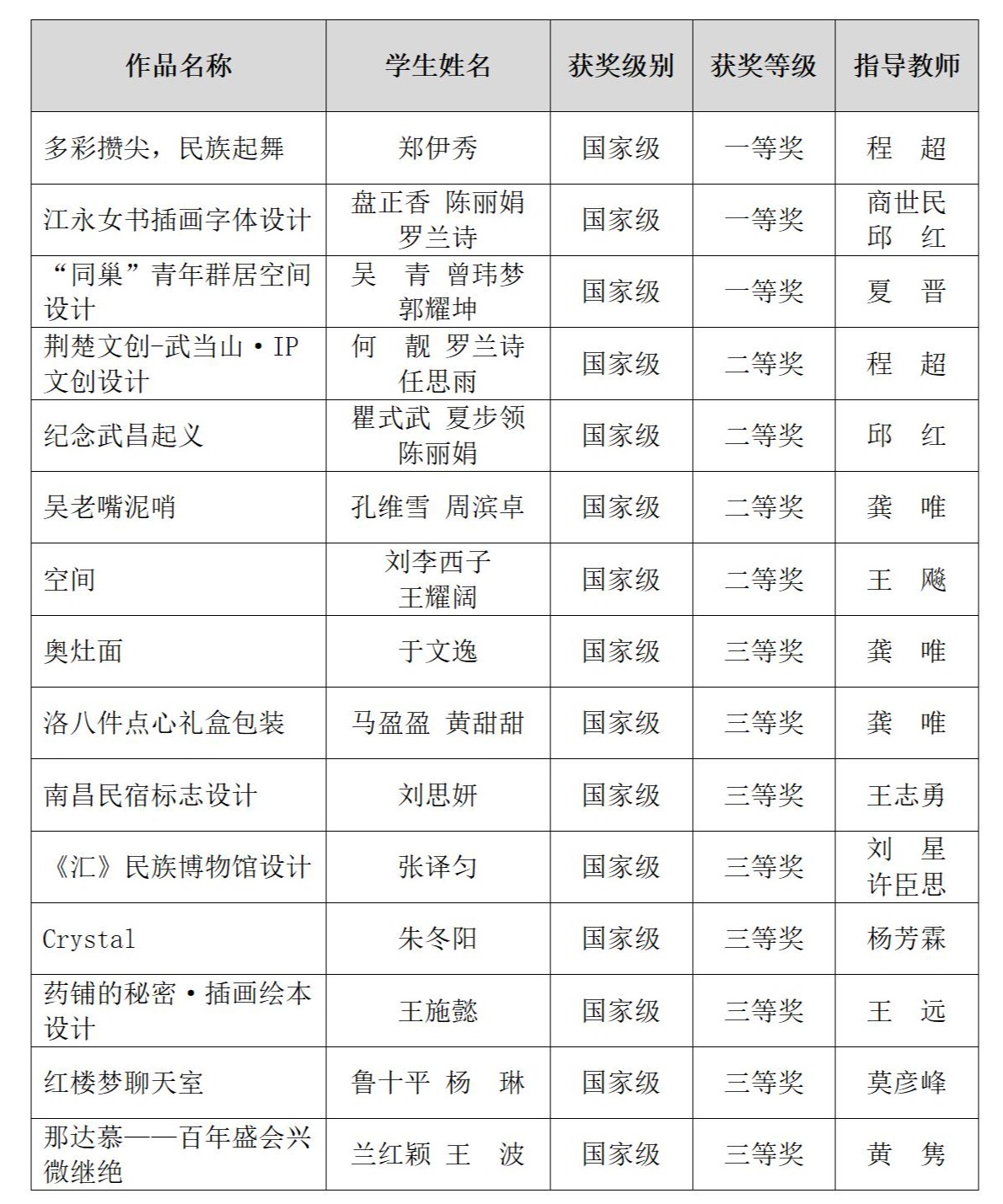 本届大赛中,程超、商世民、夏晋、邱红、龚唯、刘星等6位指导教师获得优秀指导教师称号。在省赛环节,美术学院学子有近50件作品获奖,其中一等奖11项、二等奖18项、三等奖20项。
